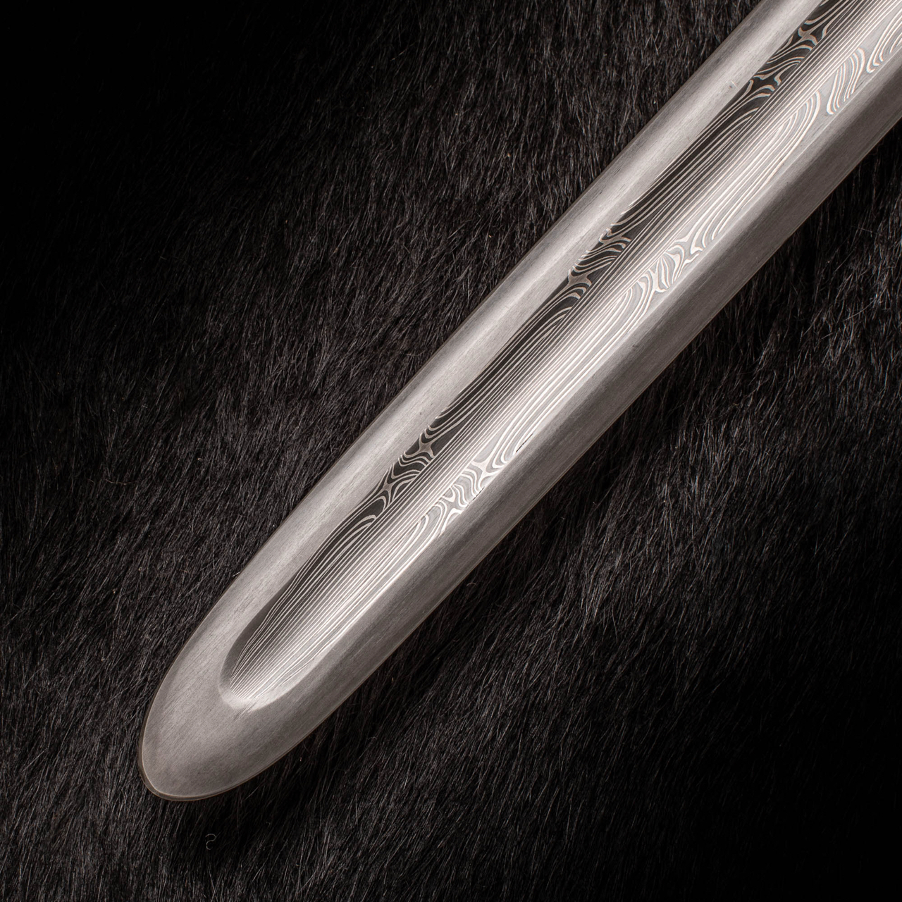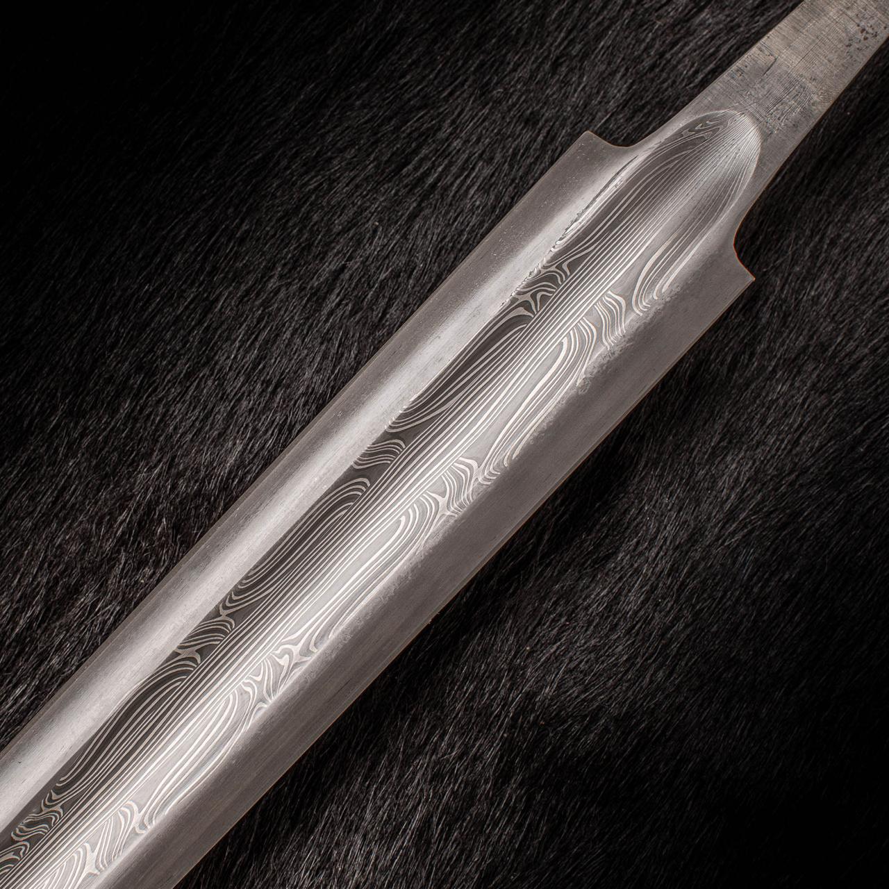 This is a 26.5″ long sword blade with Fuller’d blade section. . The blade is constructed from 3 core bars, a central pin striped bar and 2 outer bars showing alternate straight and twisted sections. The 3 steels used in its construction can be seen as bright layers and 2 darker shades. There is a carbon steel edge.