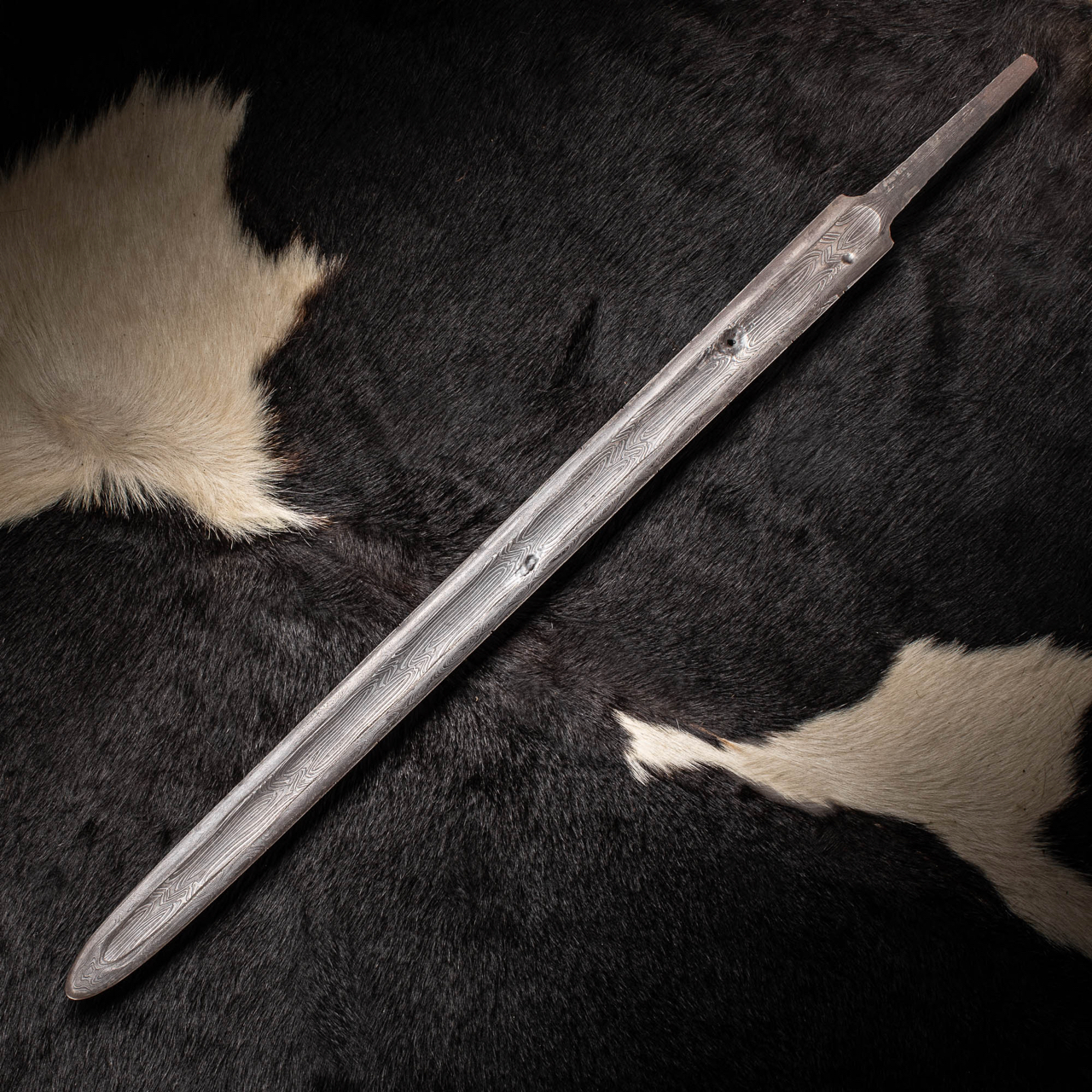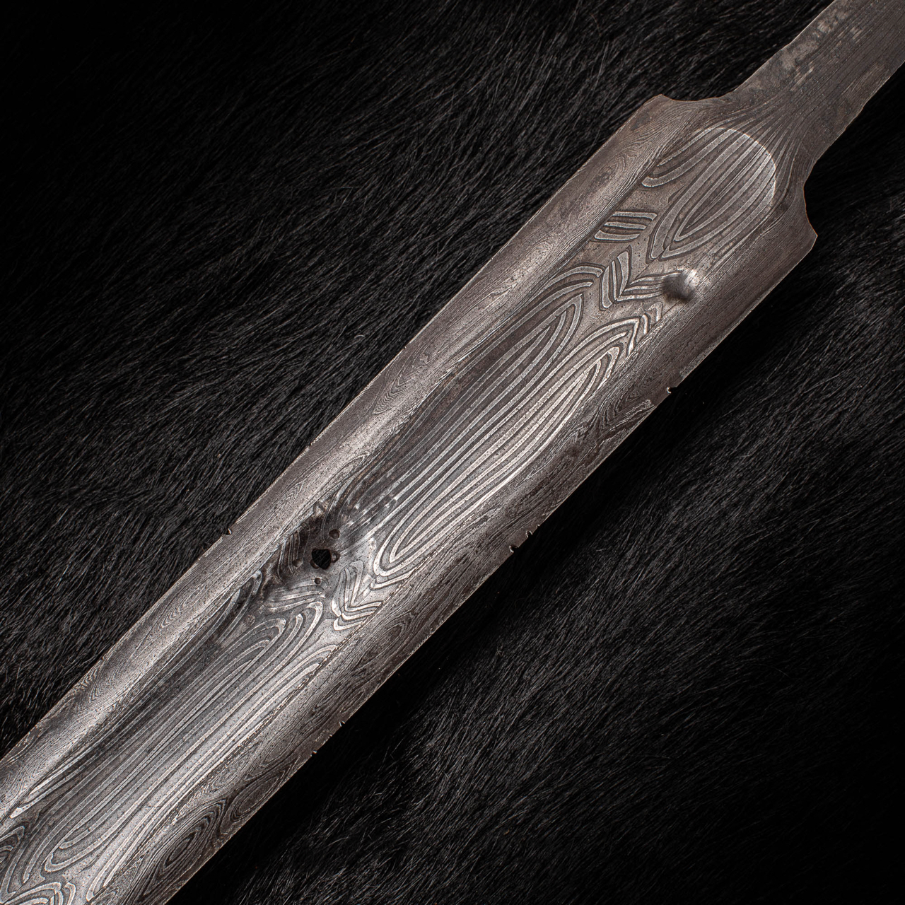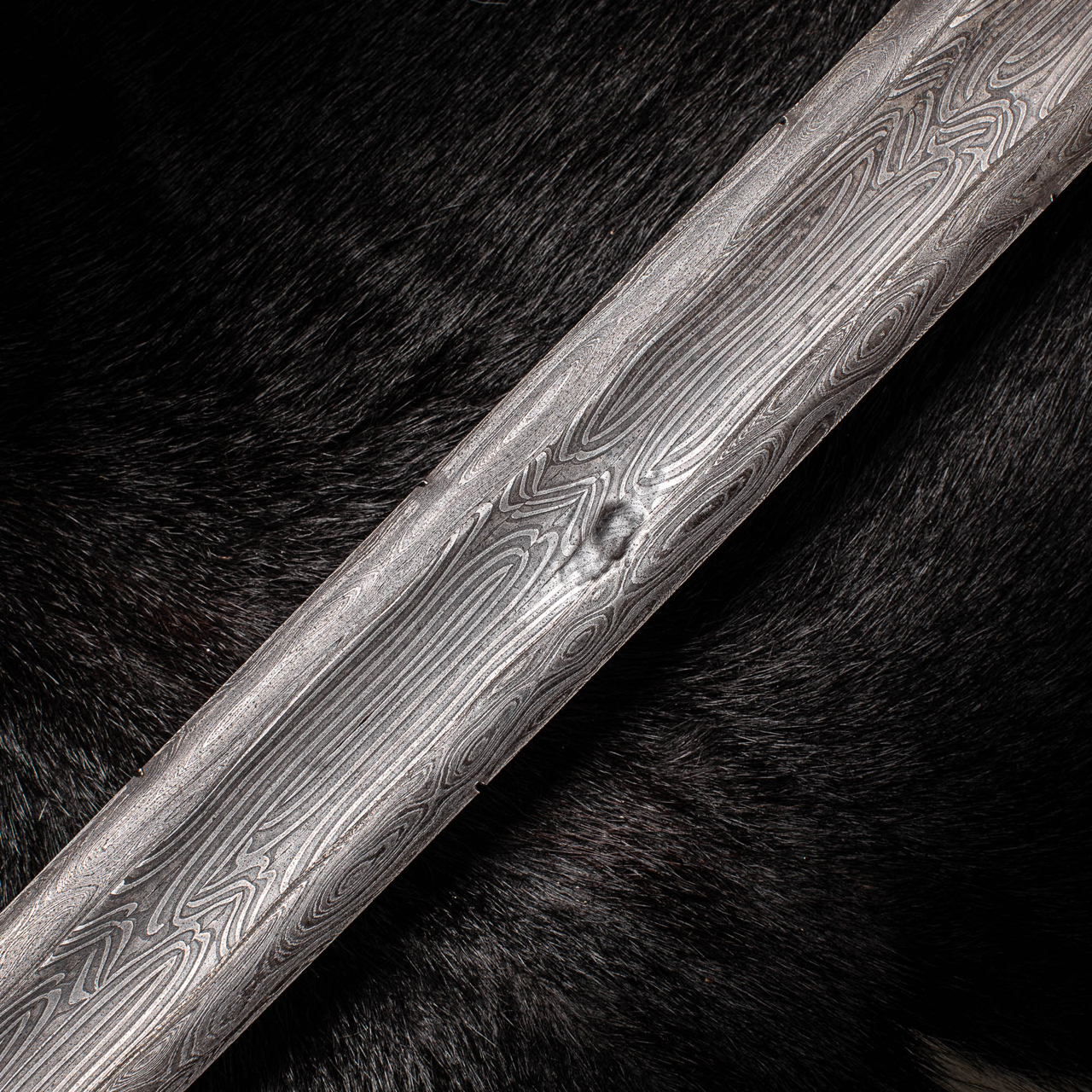 This is a 31″ long sword blade with a fullered section. It would be an appropriate blade for a broad and sturdy early Migration period or Saxon blade. The blade is constructed from 3 intermittently twisted core bars showing alternate straight and twisted sections. The 3 steels used in its construction can be seen as bright layers and 2 darker shades. There is a high layer Damascus steel edge.