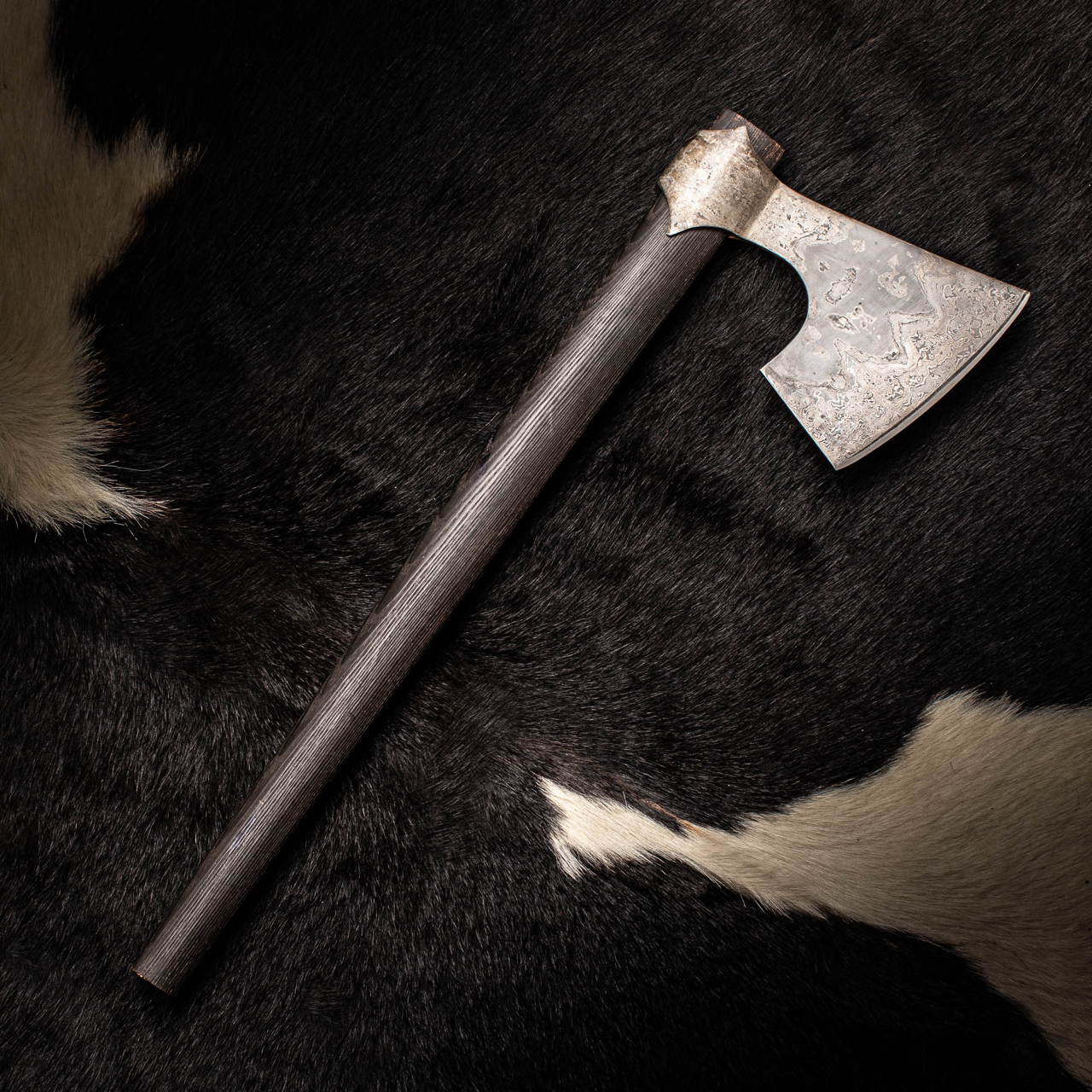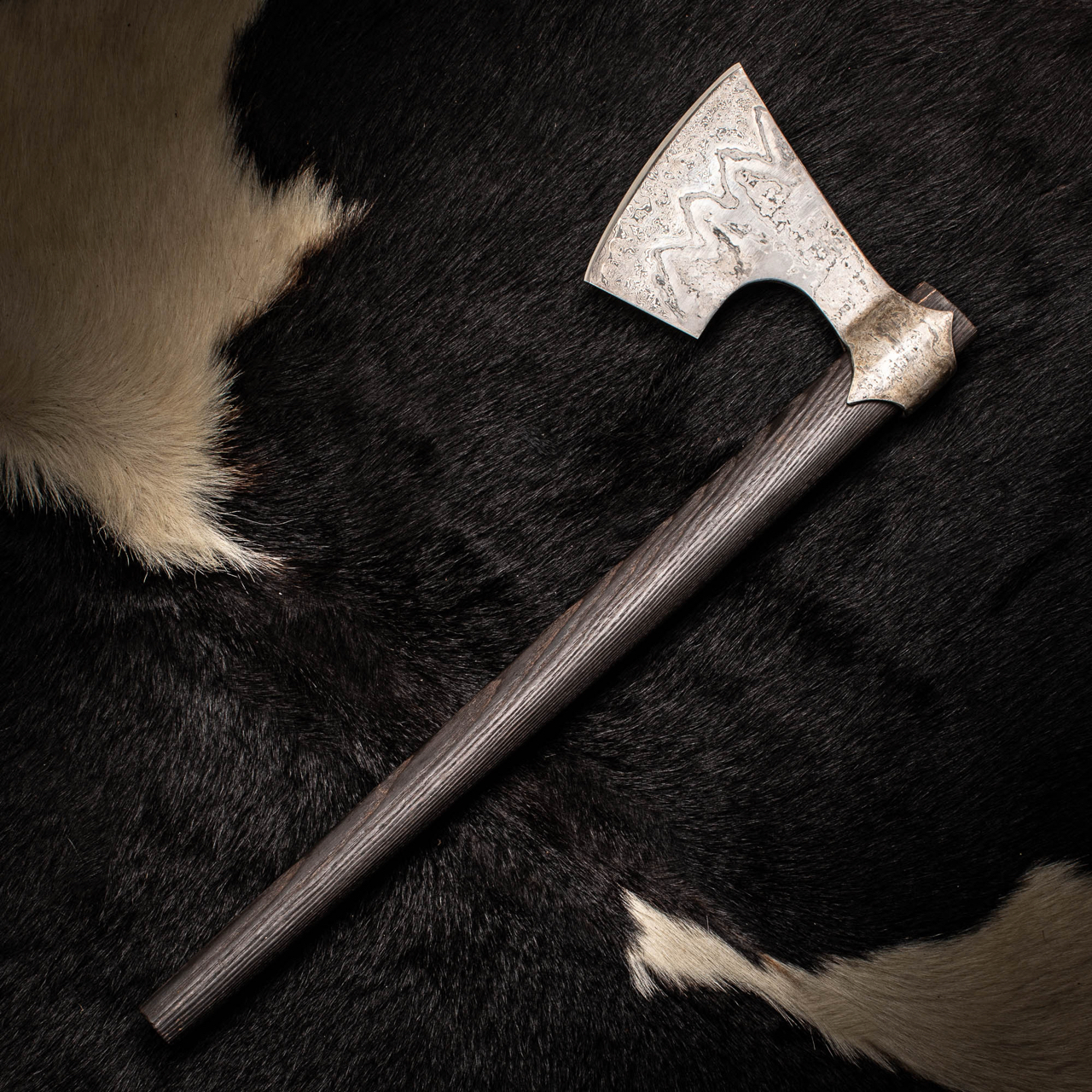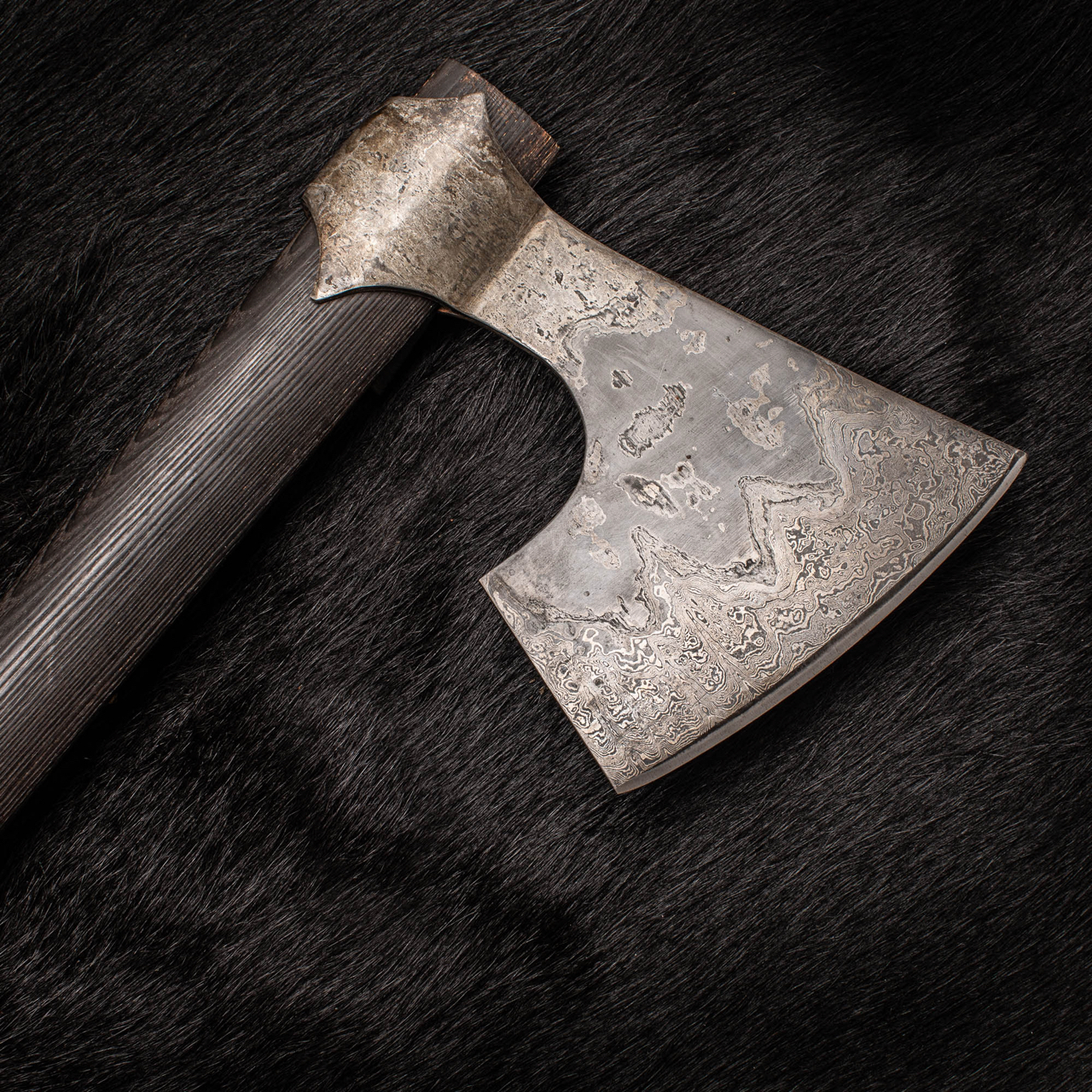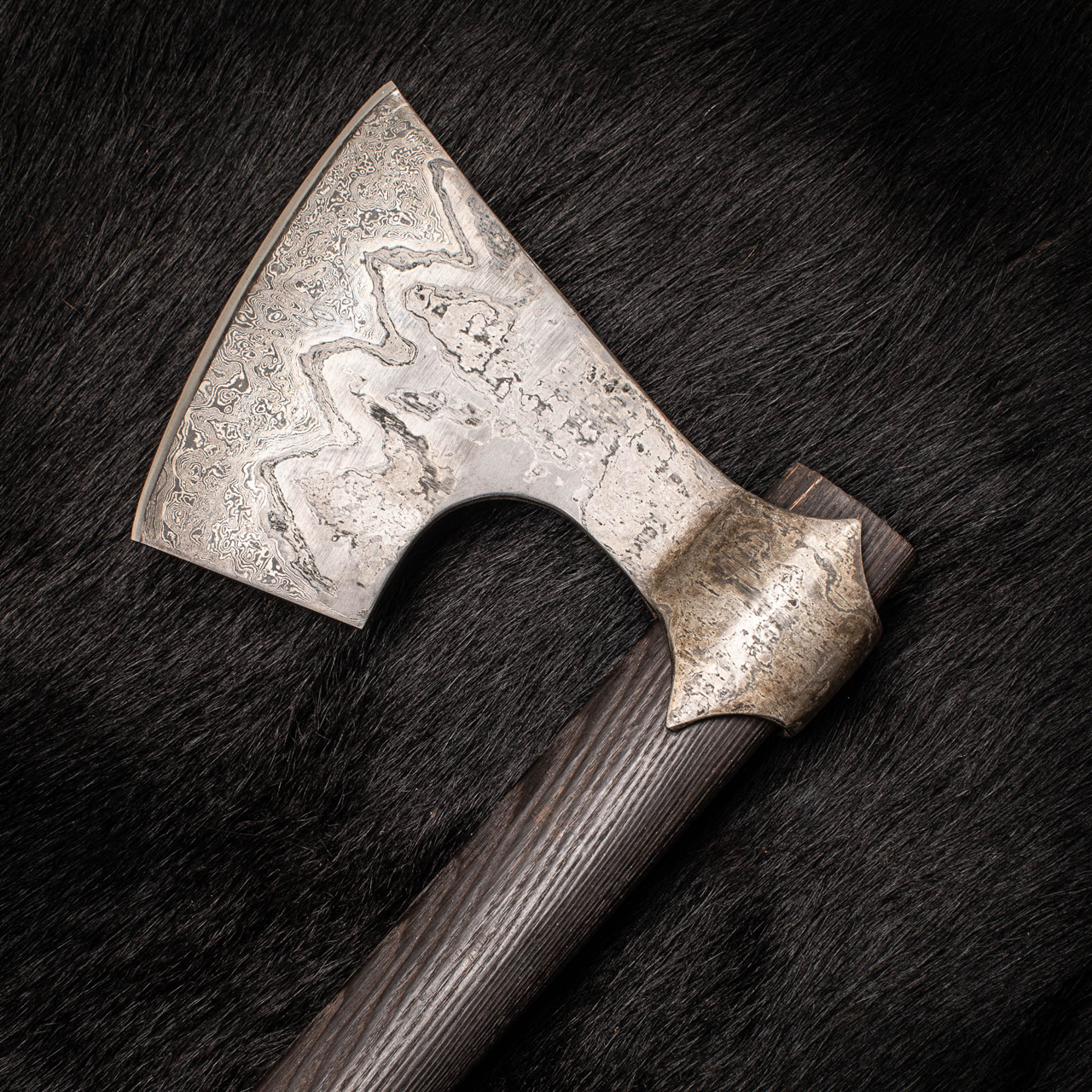 The pattern in the Damascus is formed when the hammering used to make the axe pushed layers beneath each other, the process of the making is written in the steel!