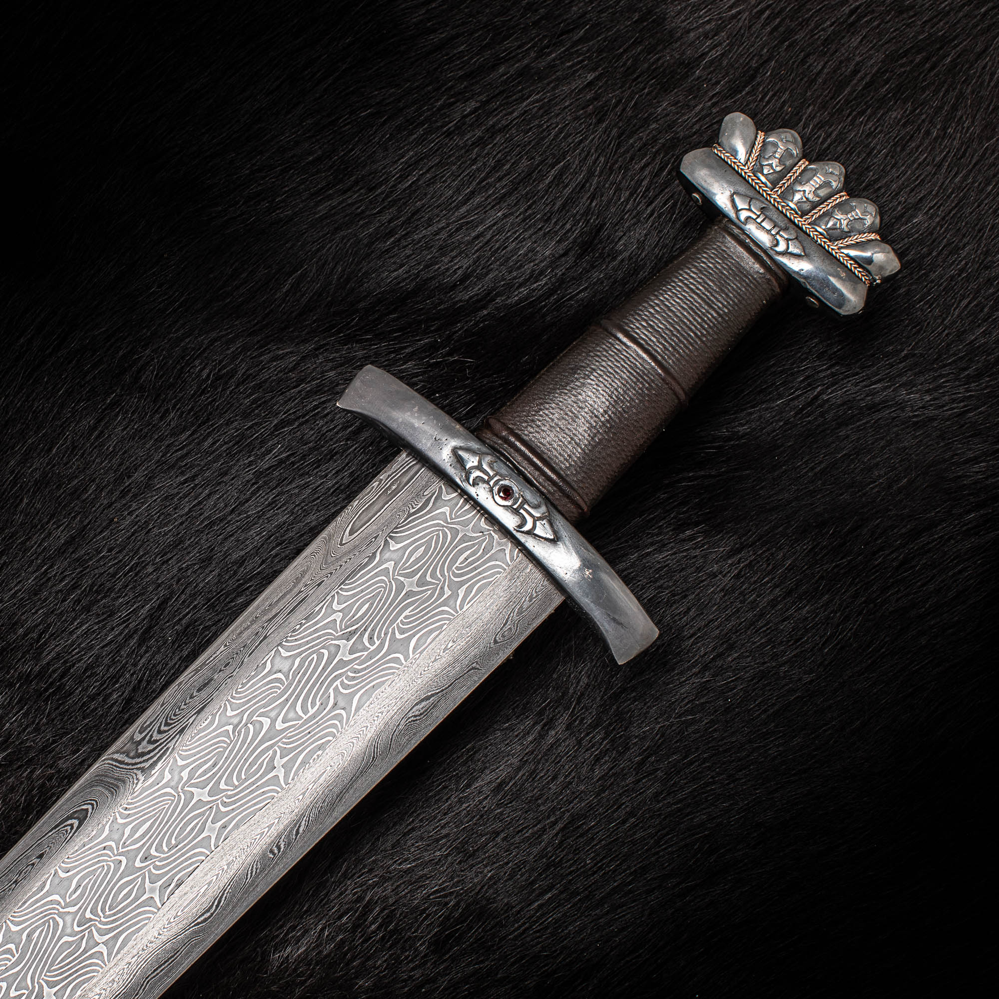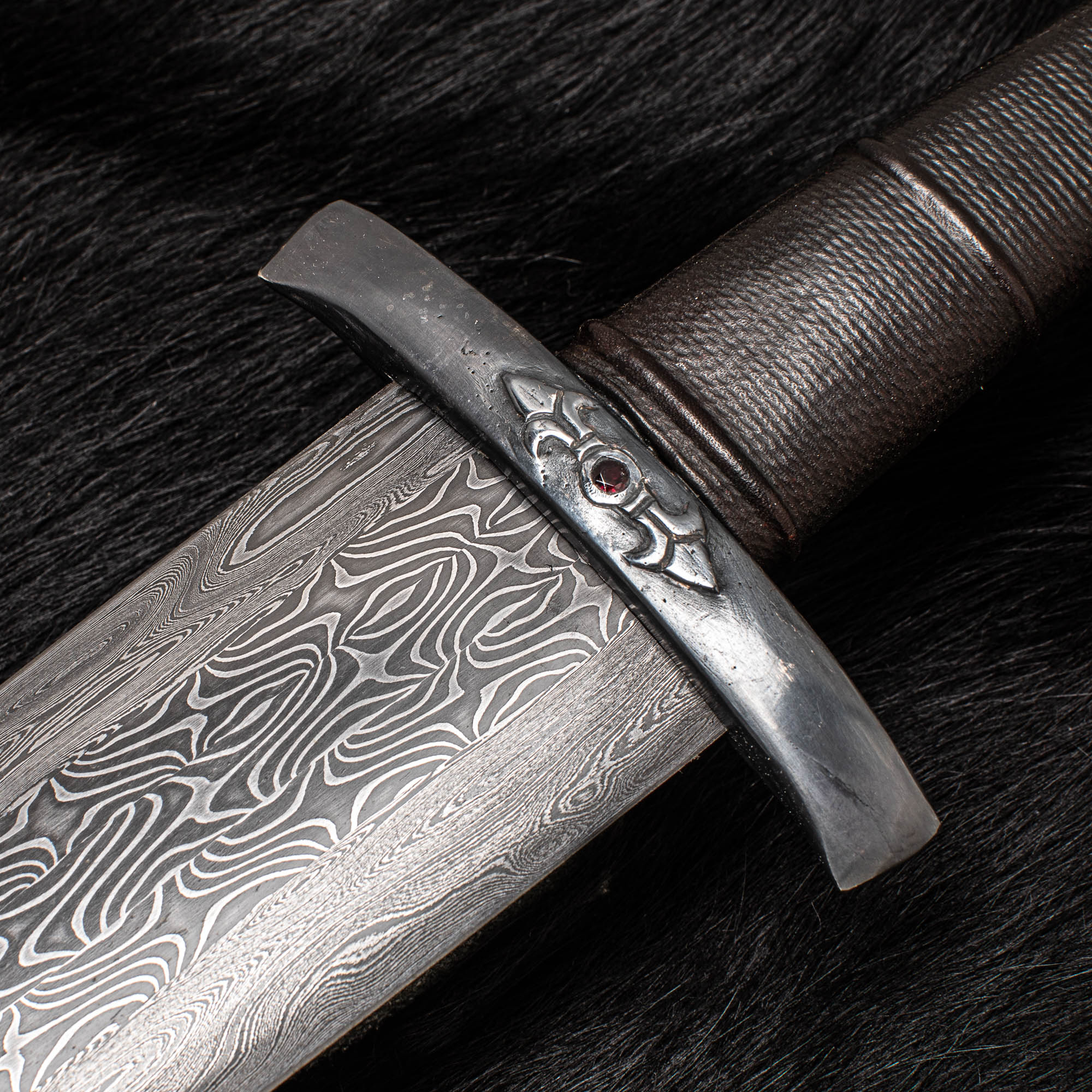 The guard and pommel  are sterling silver, with Carved Fleur de lis and a single garnet set on either side of the hilt . I have added twisted silver and copper wire to the pommel as a highlight to them…