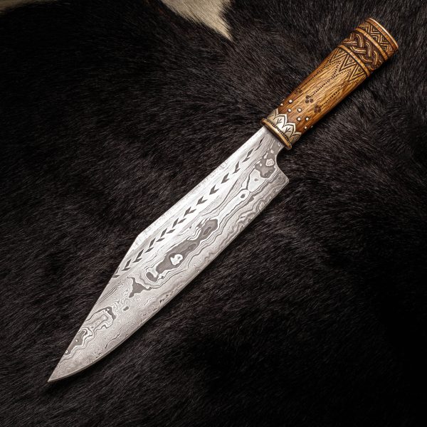 The blade is patternwelded, there is wrought iron at the spine then there are barbed chevron bars, these are mosaic bars made from many teeth . Could they be the infamous Durin’s teeth pattern so famous in ancient times?  The edge bar is heavily laddered 300-layer random Damascus and has an undulating chatoyancy along the edge.