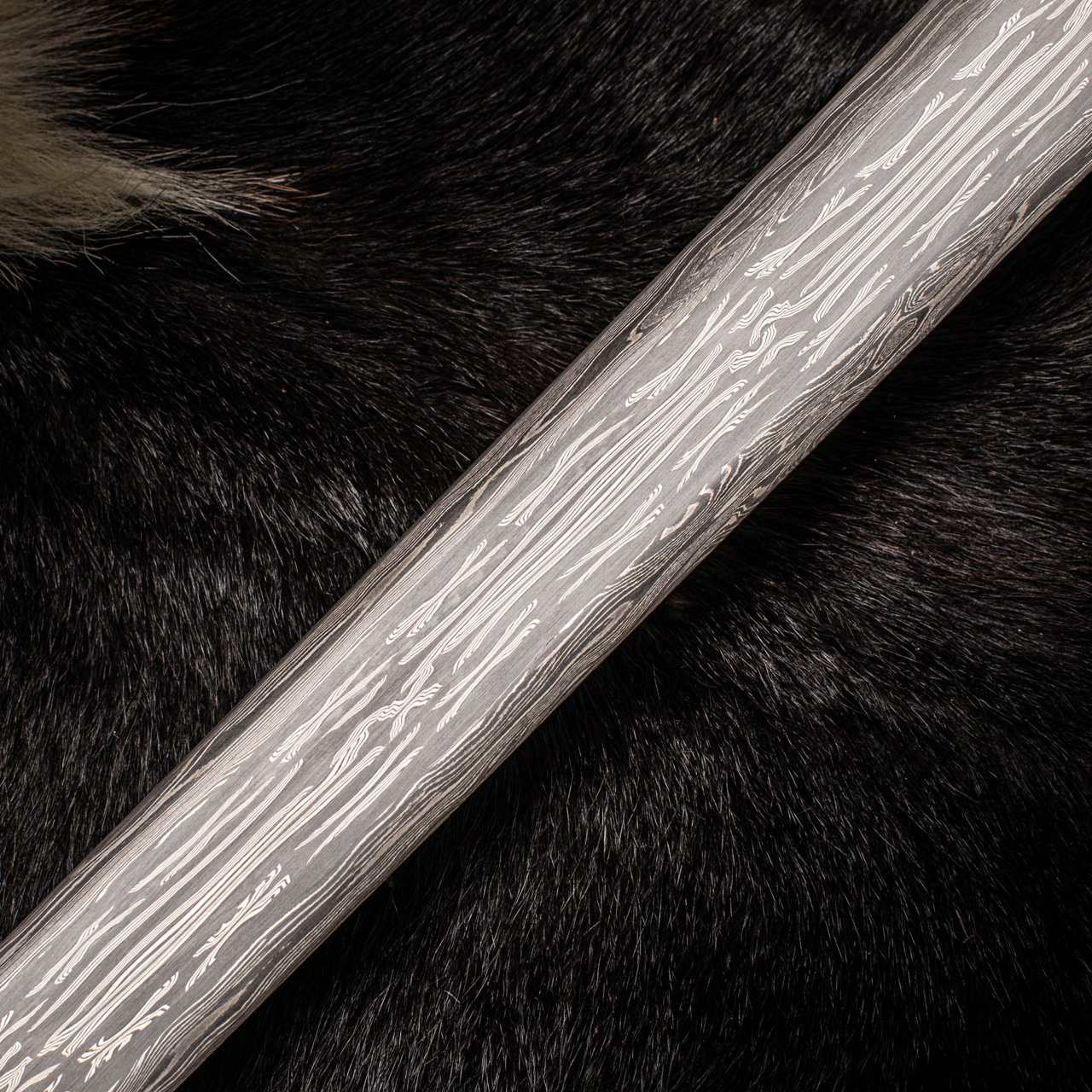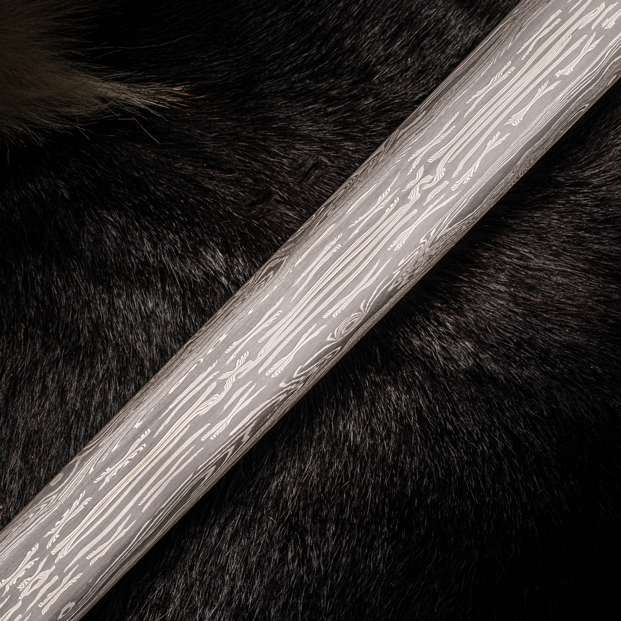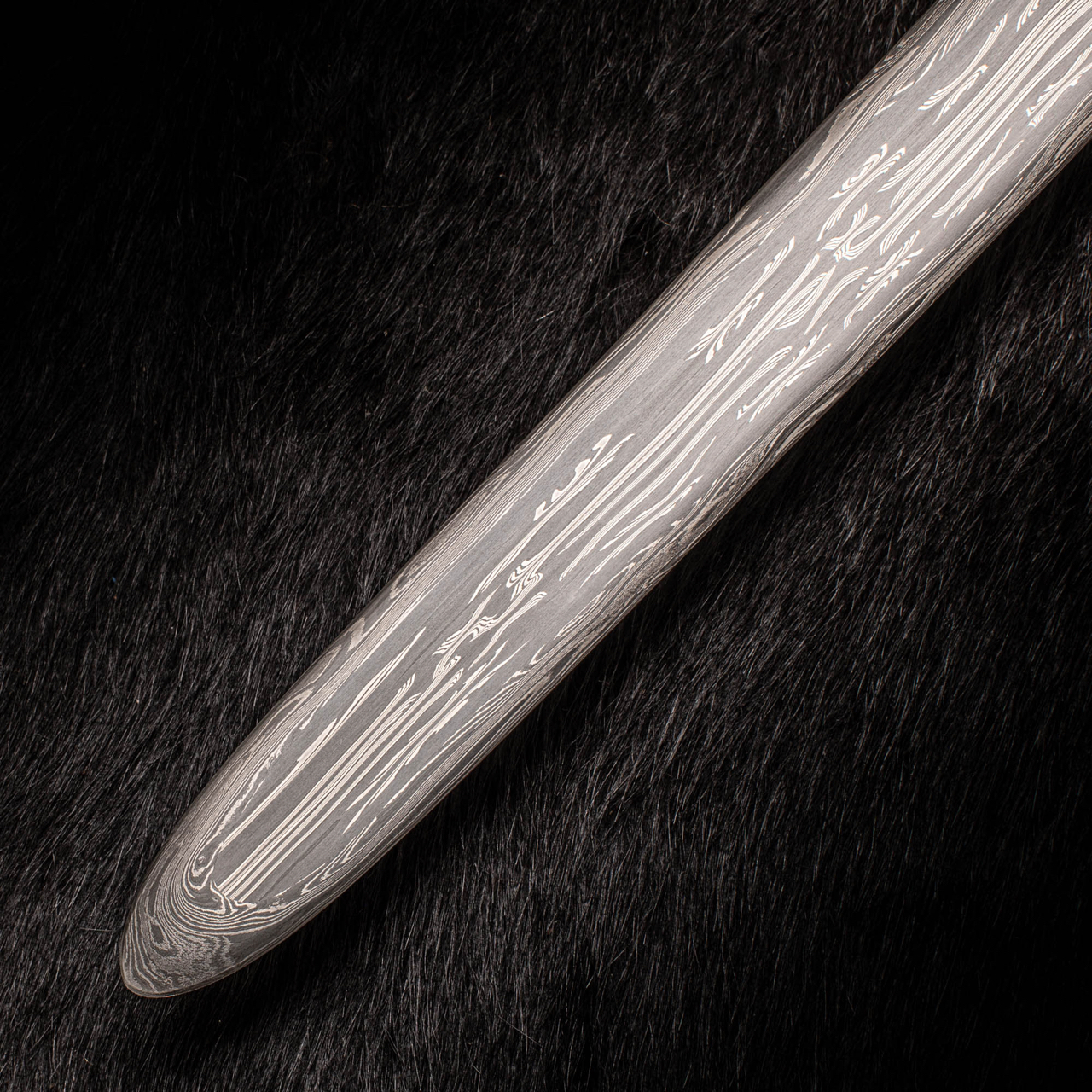 The blade is patternwelded from 10 bars of steel. The core of the sword consists of 4 twisted bars separated from each other by dark pin stripes, the two core bars are intermittent twists with pin-striped layers in between, the outer two bars are continuous twists. The 700-layer edge shows subtle patterning and adds to the understated complexity of the twists. My favourite patternwelding has elements that can be seen from a distance and then subtle patterning in the steel that draw you in, careful or you may become lost in the steel!