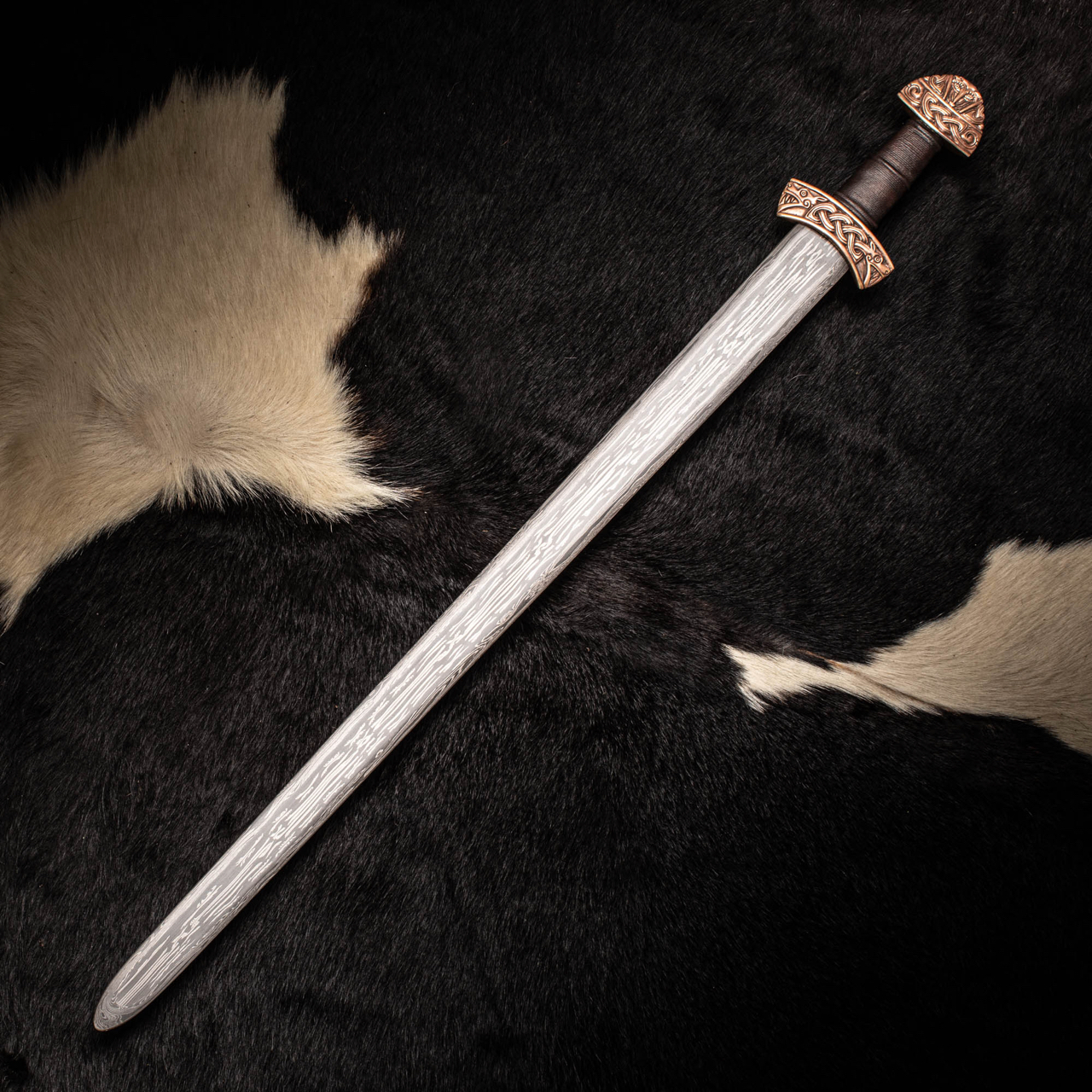 Material: the blade is made from 15N20 carbon steel, En42J carbon steel and cs80 carbon steel, the handle is veg tanned leather over ash and fittings are tin bronze.