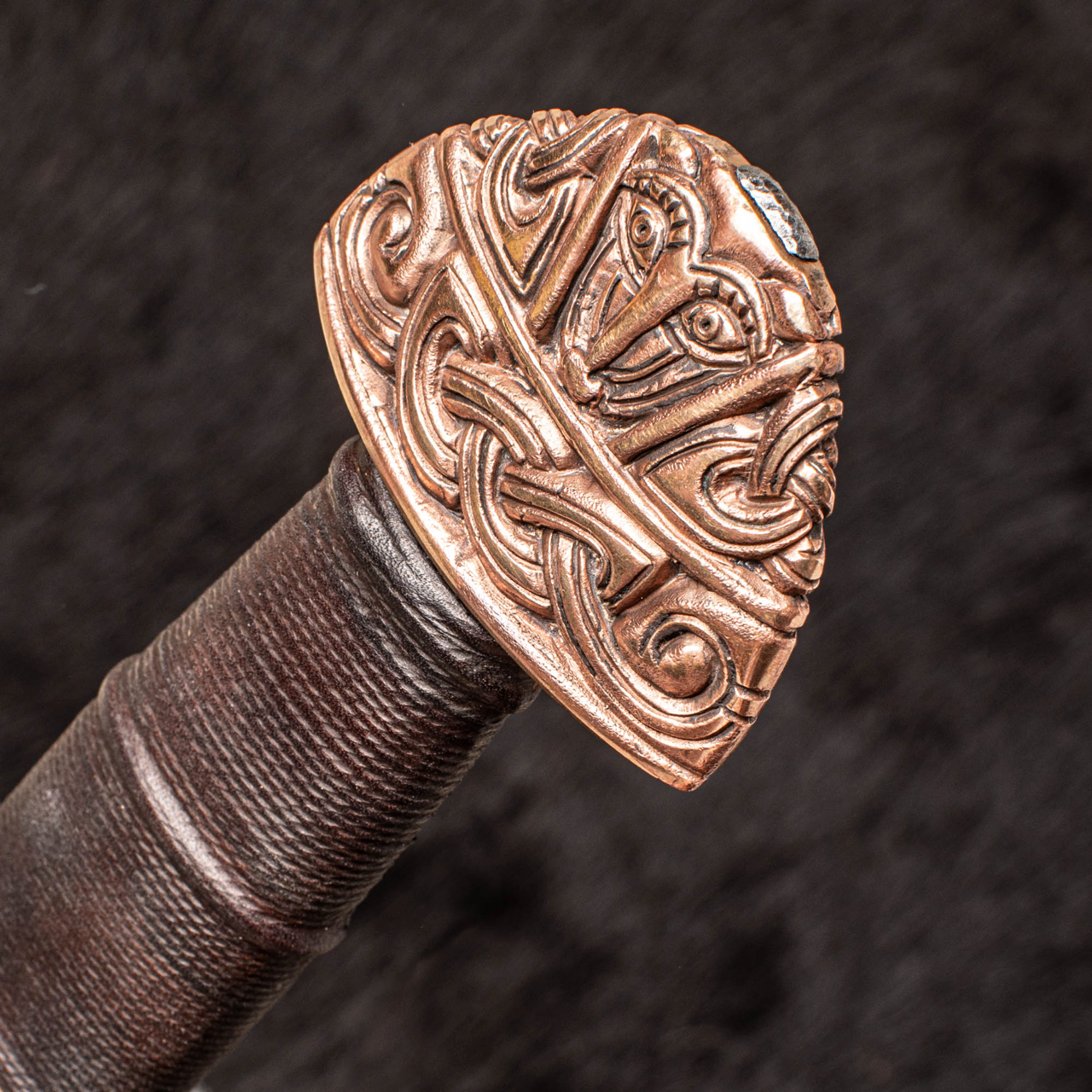 The guard and Pommel are made By Petr Florianek, both being carved in wax and then cast in Tin bronze (also known as ancient bronze) Petr came up with the design for the pommel and guard after visiting Kilpeck church with me as part of our annual artists retreat in 2023.  Kilpeck church is a wonderfully carves church dating from the end of the Saxon age nestled in the golden valley in Herefordshire. The golden Valley in Hereford is a wonderful place oozing with ancient landscape with red soil and rolling hills. I’m drawn back there time and again where the imagination can grow in deep red soil in the shadow of the black mountains. the golden valley is supposedly the place that  Tolkien based his “shire” on.